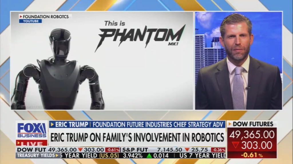 During the Thursday broadcast of her Fox Business show, Bartiromo devoted more than 10 minutes of her program to a fawning joint interview with Foundation Future Industries CEO Sankaet Pathak and Eric Trump, the company’s “chief strategy adviser.” After Bartiromo congratulated the pair on winning a $24 million Defense Department contract to test its “Phantom” robot for military applications, she gave them a platform to talk up their product, as well as what Bartiromo described as “these incredible goals that you’ve got,” including to “build life-sustaining technology on Earth and beyond."